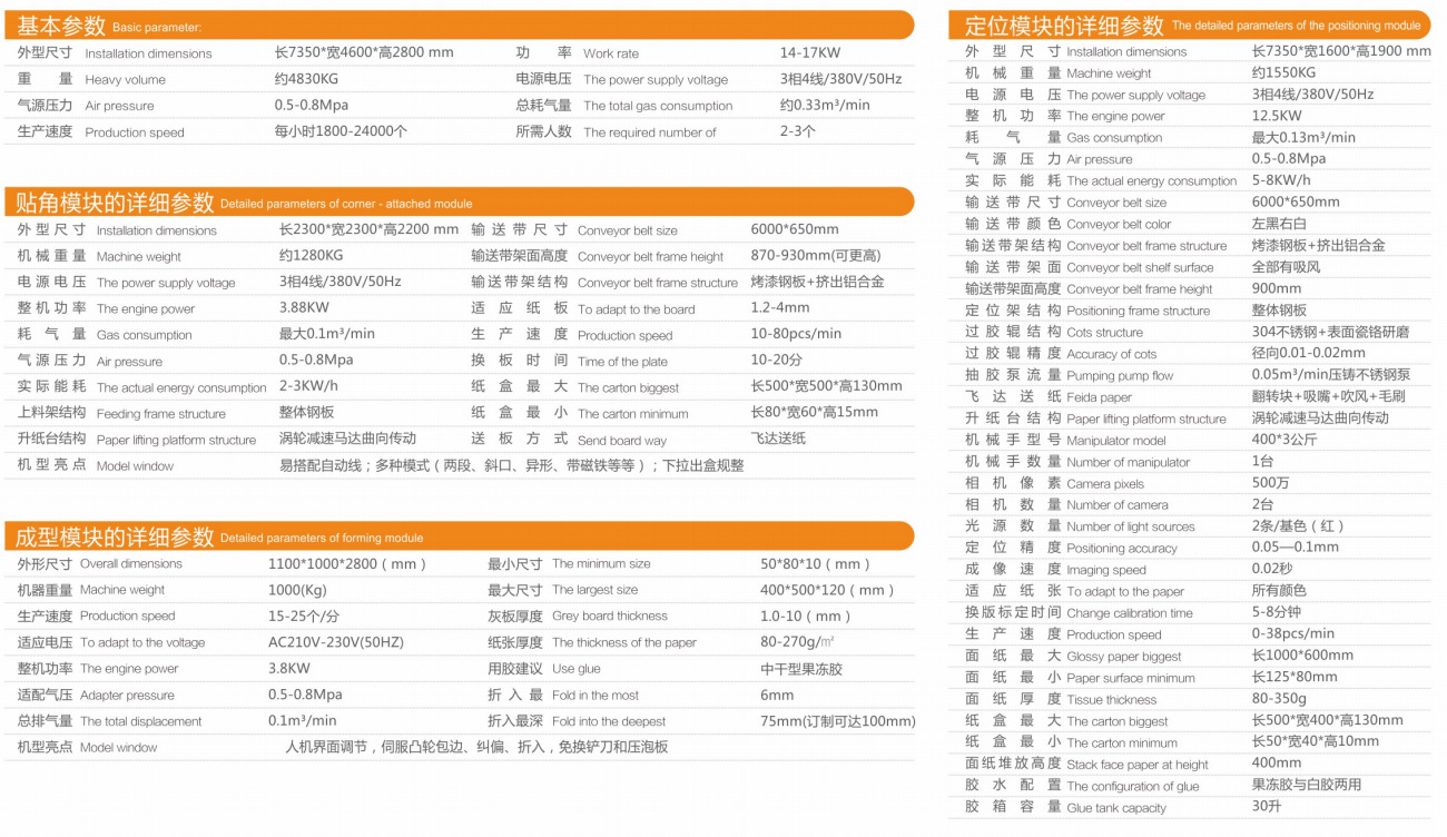 The machine is mainly divided into three parts: positioning module, angle sticking module and forming module. It can realize automatic paper feeding, automatic glue passing, automatic angle sticking, automatic positioning, automatic forming and automatic bubble pressing in the production of all kinds of cartons, wooden boxes and plastic boxes. A series of technological processes can be completed automatically, the plate can be transferred quickly, and the box body can be made exquisitely I'm not. Non adhesive tape slot and double lift paper table of corner module. The intelligent adjustment, automatic locking, servo cam action, no change blade and pressure foam board of the molding module are designed and produced by our company, and have obtained a number of national patents.